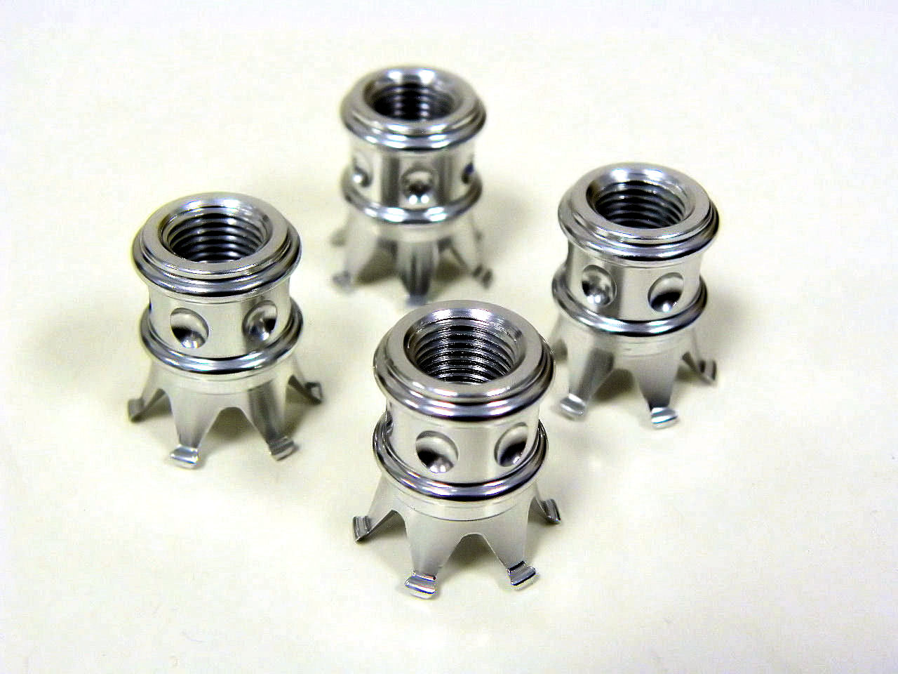 Made of CNC High Quality Billet T-6061 Aluminum and then hard anodized in Silver High Polish color for a long Lasting Finish. They are sold in sets of 4 Pieces And will fit virtually any Motorcycle,Car,Truck,SUV,ATV Etc.